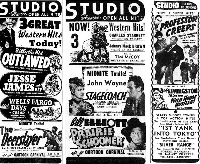 A "Three Mesquiteers" B western featuring John Wayne was one of the two features at the Studio the day this picture was taken in 1944. Photo from the Jack Tillmany Collection, used with permission.